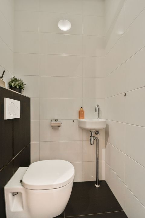 Er is in de hal een meterkast (9 groepen, 3 aardlekschakelaars en een hoofdschakelaar), een garderobenis en een geheel wit/antraciet betegelde toiletruimte met zwevend closet en een fonteintje.