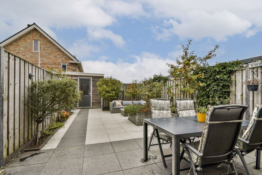 De woning is gelegen op 150m² eigen grond en aan de achterzijde vind je de tuin (noordwest) met houten berging en een poort naar de aangrenzende privé-parkeerplaats. De parkeerplaats sluit aan bij het achterliggende mandelige gebied.