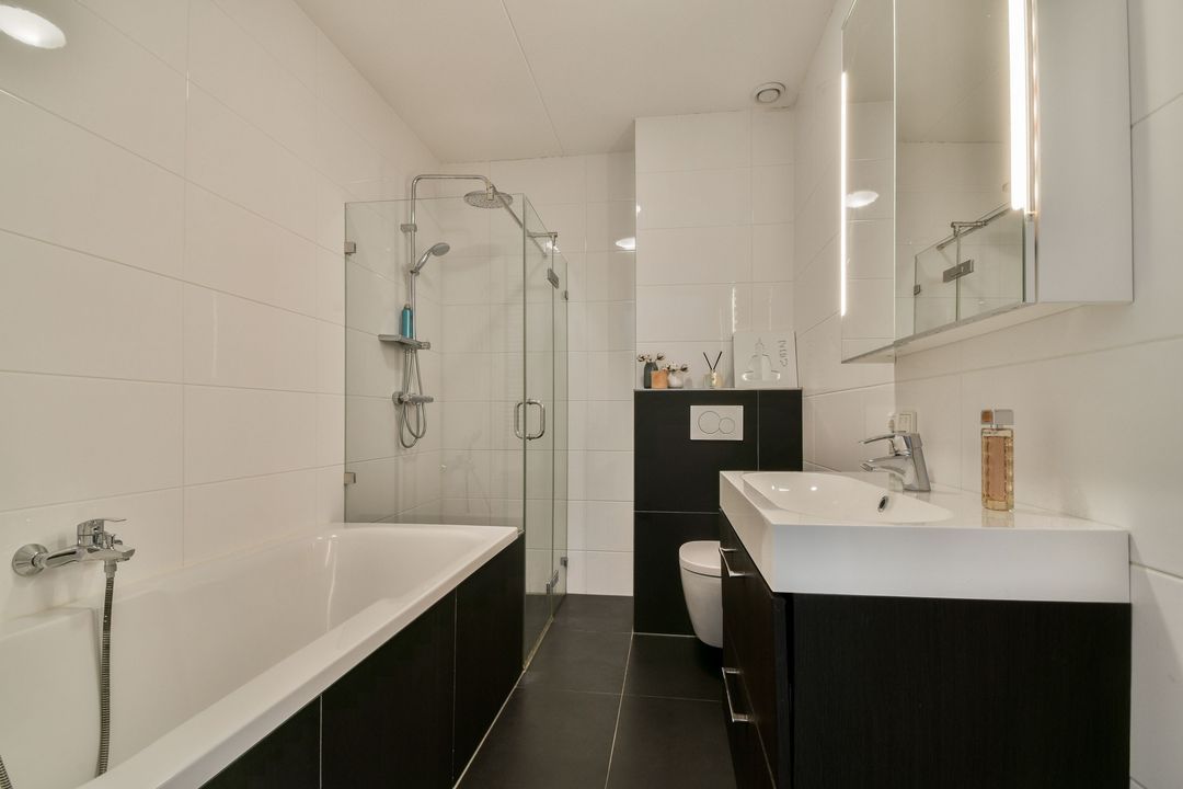 De moderne badkamer is ook weer ruim van opzet en heeft witte- en antracietkleurige betegeling. De badkamer is voorzien van een ligbad, een brede inloopdouche met glazen scherm, een handdoekradiator, een 2e toilet en een breed wastafelmeubel met daarboven een spiegelkast met verlichting.
