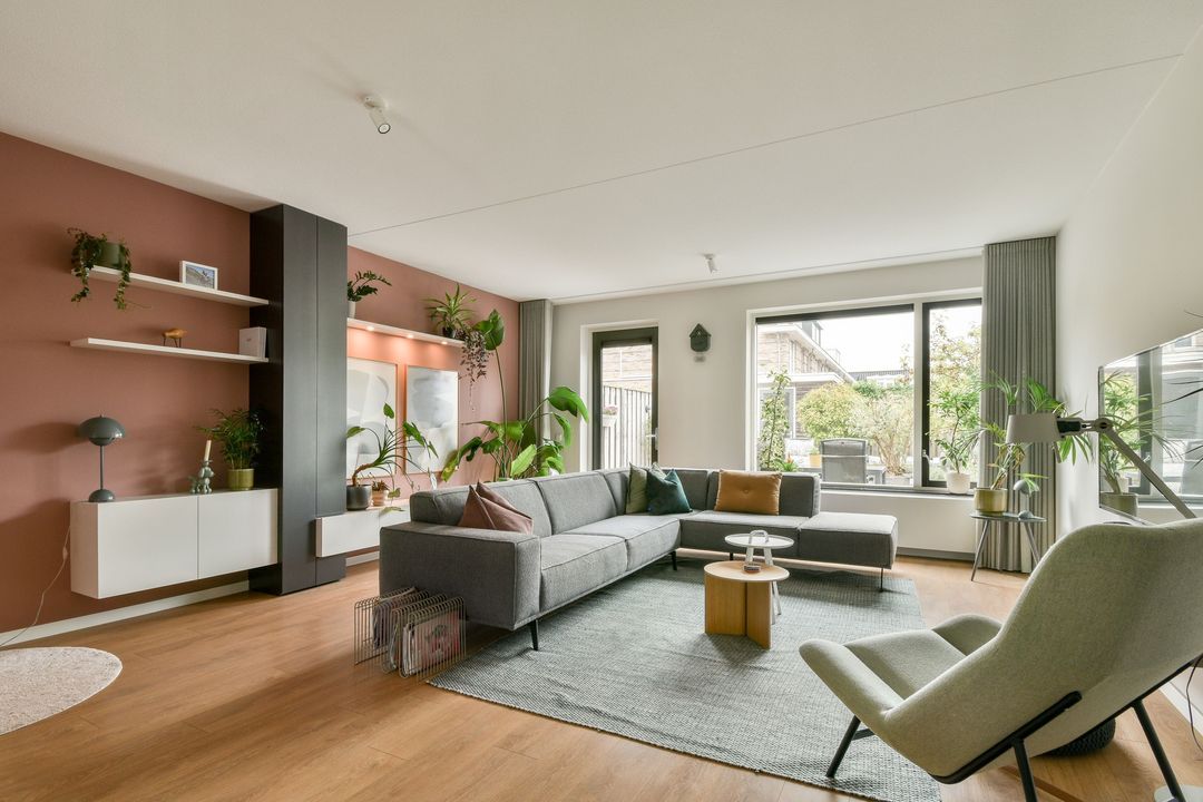 Via de tussendeur kom je in de riante living. De woonkamer is vanuit de bouw voorzien van een uitbouw van 2.4m en vanuit de woonkamer heb je leuk zicht op de achtertuin. Wat een ruimte! Er is een trapkast en de open keuken aan de voorzijde benadrukt de breedte van de woning, deze is namelijk breed van opzet. Deze hoekkeuken is uitgevoerd met een hoge opstelling in hoogglans wit voorzien van een koelkast, vriezer, combi-oven en bergruimte. De lage opstelling is voorzien van een composiet aanrechtblad met kokend- waterkraan, vaatwasser, 5-pits gaskookplaat en een afzuigkap (met afvoer naar buiten). Vanuit de keuken heb je een leuk zicht op het groen en de waterwig.
