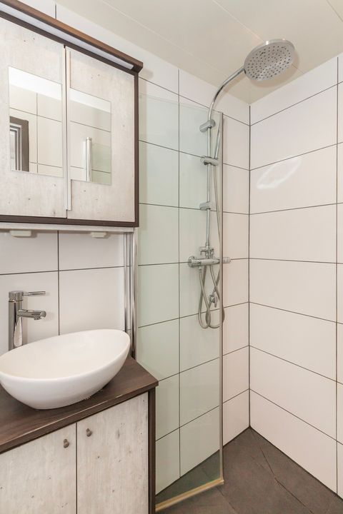 De moderne badkamer is toegankelijk vanuit de keuken en uitgevoerd met witte wandtegels, grijze vloertegels, een douchehoek met glazen deuren, een wastafelmeubel met waskom en een spiegelkast. In een kast is de c.v. combiketel geplaatst (Remeha Tzerra).