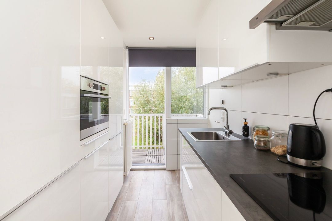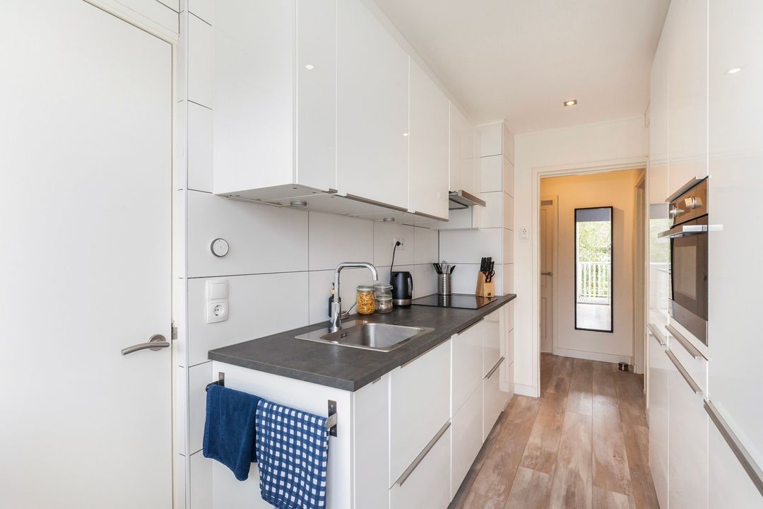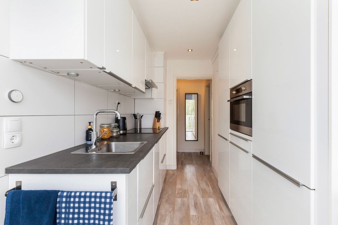 De keuken is strak modern uitgevoerd in het hoogglans wit met een antraciet aanrechtblad. De keuken is voorzien van een inductiekookplaat met vlakschermafzuigkap en een vaatwasser. In het hoge kastengedeelte bevinden zich de koelkast, vriezer, combi-oven en de aansluiting voor de wasmachine.