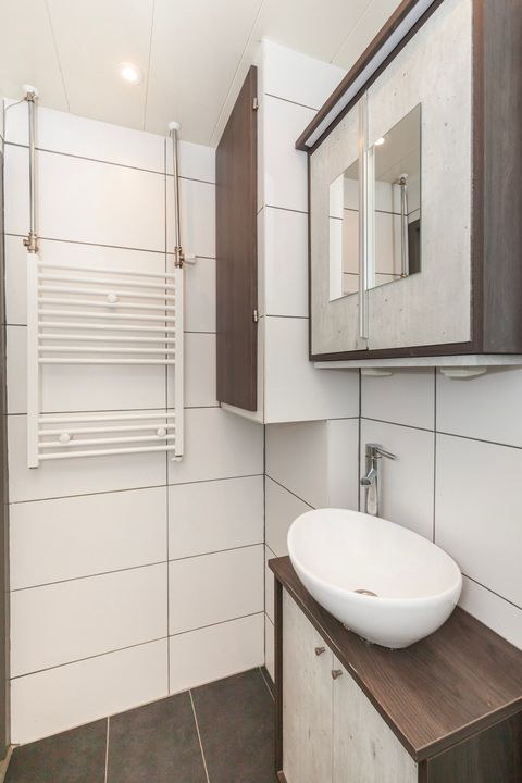 De badkamer is eveneens modern uitgevoerd met witte wandtegels en grijze vloertegels, een douchehoek met glazen deuren, een wastafelmeubel met waskom en spiegelkast.