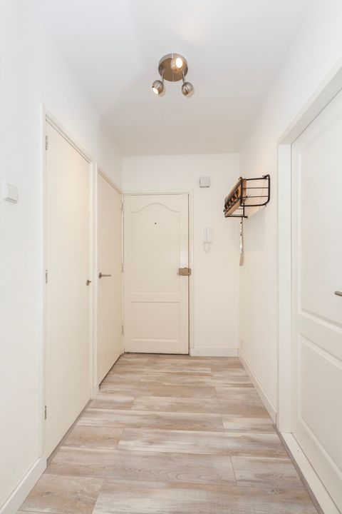De entree van het appartement is gelegen op de 3e verdieping. Je komt binnen in een ruime hal met meterkast (vernieuwd in 2020) en een moderne toiletruimte met witte wandtegels, een houtlook vloertegel en een zwevend toilet.