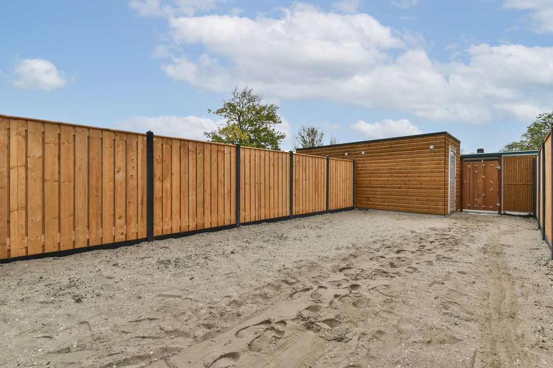 De woonkamer is direct met 2.4m aan de achterzijde uitgebouwd waardoor een ruime woonkamer is ontstaan! Deze heeft een trapkast met verdeler voor de vloerverwarming en een brede schuifpui naar de tuin. Deze achtertuin is reeds afgegraven en voorzien van zand. De schuttingen zijn recent geplaatst en er is een elektra- en wateraansluiting aanwezig.
