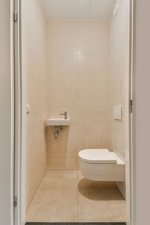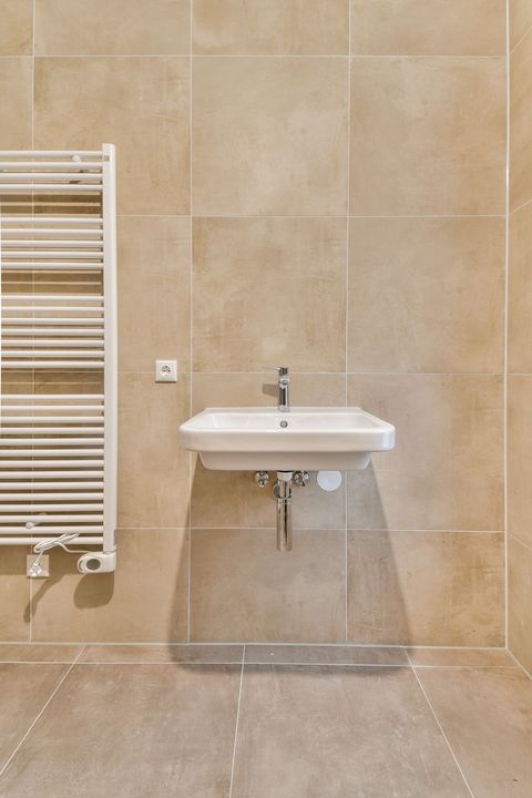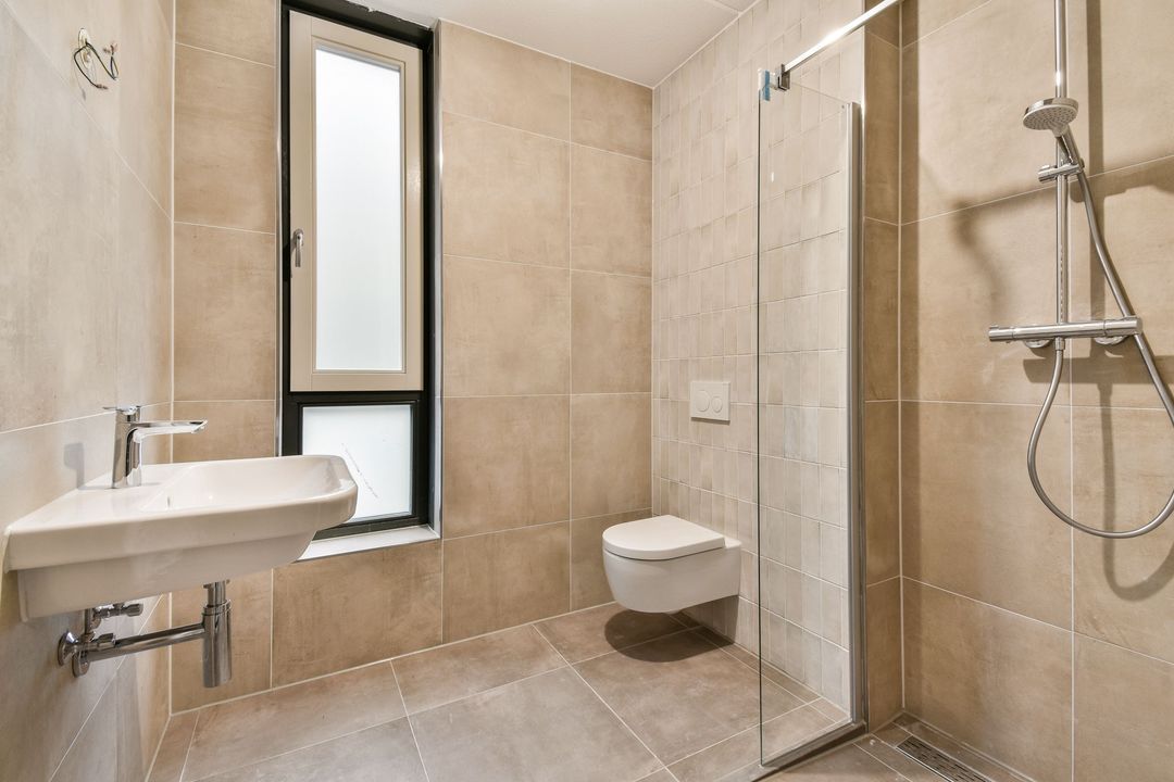 De badkamer is geheel luxe betegeld met een zandkleurige 60x60 tegel en is afgewerkt met een inloopdouche met drain, 2e toilet, wastafel, handdoekenradiator en het raam met folie zorgt voor zowel daglicht als de gewenste privacy. Achter het toilet is bovendien een stijlvolle accenttegel in een bijpassende zandtint aangebracht.