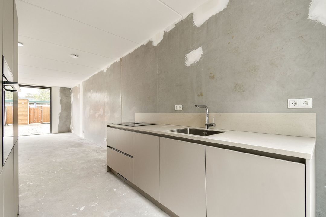De woonkamer is ruim en heeft een schuifpui naar de ruime achtertuin en aan de voorzijde staat de gloednieuwe keukenopstelling. Deze is uitgevoerd in een moderne, zachte leemkleur en heeft een opstelling aan beide kanten. Een grote raampartij zorgt hier voor volop natuurlijk licht.